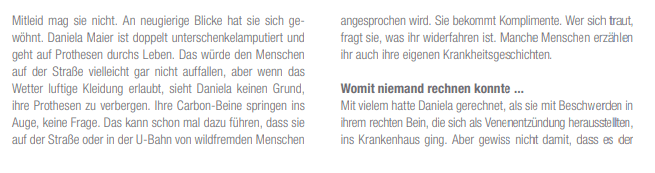 Ich gebe Einblicke weshalb es wichtig ist, nach so einem Schicksalsschlag die eigenen Prioritäten für sich zu klären, anstatt mit einem Auge auf die vermeintlichen Vorzeigeamputierten zu schielen – was in Zeiten von Social Media, übertriebenem Perfektionismus und dem Bedürfnis der Leistungsgesellschaft aus allem eine Wettbewerb zu machen, oft gar nicht so einfach ist.
