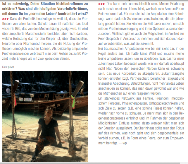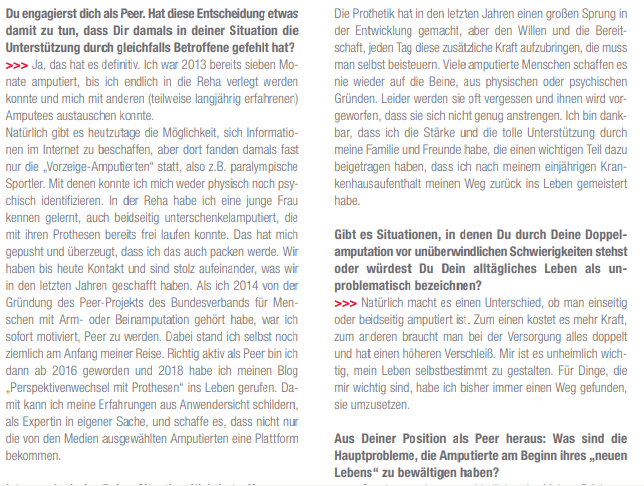 Im Interview erzähle ich über mein Herzensthema, das Projekt „Peers im Krankenhaus“, also die Beratung von Menschen denen die Amputation noch bevor steht bzw. die frisch amputiert sind. Warum es meiner Meinung nach so wichtig ist das Projekt weiter zu stärken und in den Kliniken als festes Beratungsangebot zu etablieren.